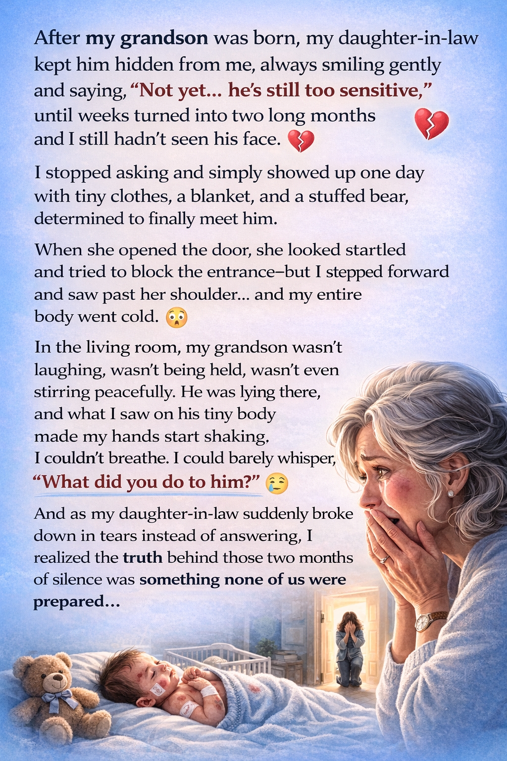 “I brought gifts,” I said gently. “I just want to see the baby.”